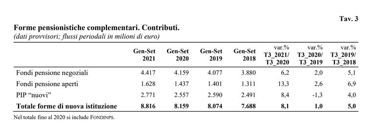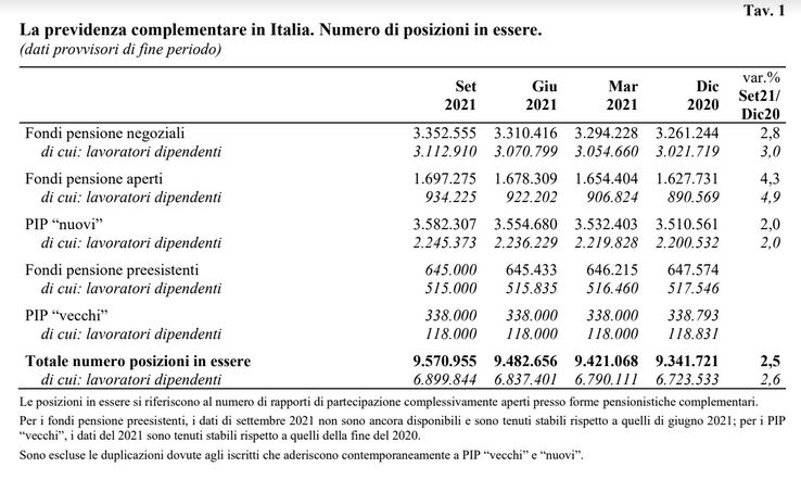 A settembre del 2021 le posizioni in essere presso le forme pensionistiche complementari sono 9,571 milioni, in crescita di 229.000 unità (+2,5 per cento) rispetto alla fine del 2020. A tale numero di posizioni, che include anche quelle di coloro che aderiscono contemporaneamente a più forme, corrisponde un totale degli iscritti che può essere stimato in 8,650 milioni di individui.