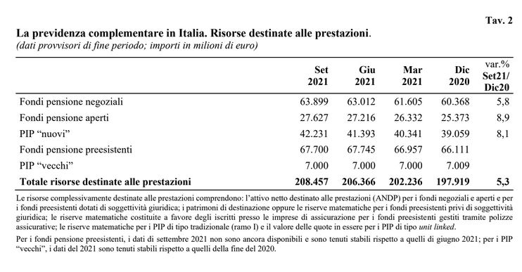 Le risorse destinate alle prestazioni sono, a fine settembre 2021, pari a 208,5 miliardi di euro, circa 10,5 miliardi in più rispetto a fine 2020. Nei fondi negoziali, l’attivo netto è di 63,9 miliardi di euro, il 5,8 per cento in più. Nelle forme di mercato, esso ammonta a 27,6 miliardi nei fondi aperti e a 42,2 miliardi nei PIP “nuovi” aumentando, rispettivamente, dell’8,9 e dell’8,1 per cento. Nei nove mesi del 2021 le forme pensionistiche di nuova istituzione hanno incassato 8,8 miliardi di euro di contributi. Rispetto al corrispondente periodo del 2020, segnato dalla diffusione dell’emergenza epidemiologica, i flussi contributivi aumentano di circa 660 milioni di euro (+8,1 per cento). L’incremento si riscontra in tutte le forme pensionistiche, con variazioni tendenziali che vanno dal 6,2 per cento dei fondi negoziali, all’8,4 dei PIP fino al 13,3 per cento dei fondi aperti.