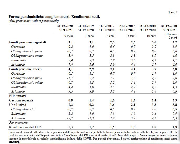 Nei nove mesi del 2021 i risultati delle forme complementari sono stati in media positivi, soprattutto per le linee di investimento caratterizzate da una maggiore esposizione azionaria. Al netto dei costi di gestione e della fiscalità, i rendimenti si sono attestati, rispettivamente, al 3,1 e al 4,1 per cento per fondi negoziali e fondi aperti; nei PIP di ramo III essi sono stati pari al 7,3 per cento. Per le gestioni separate di ramo I, che contabilizzano le attività a costo storico e non a valori di mercato e i cui rendimenti dipendono in larga parte dalle cedole incassate sui titoli detenuti, il risultato è stato pari allo 0,9 per cento. Valutando i rendimenti su orizzonti più propri del risparmio previdenziale, nel periodo da inizio 2011 a fine settembre 2021, il rendimento medio annuo composto è stato pari al 3,7 per cento per i fondi negoziali, al 3,8 per i fondi aperti, al 3,8 per i PIP di ramo III e al 2,3 per cento per le gestioni di ramo I; nello stesso periodo, la rivalutazione del TFR è risultata pari all’1,9 per cento annuo.
